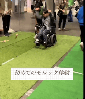 当事業所の車いすユーザースタッフは、初めて「モルック」を体験。個人戦形式で、的に向かってピンを倒すシンプルなルールのスポーツで、誰でも気軽に楽しめる競技として人気があるそうです。