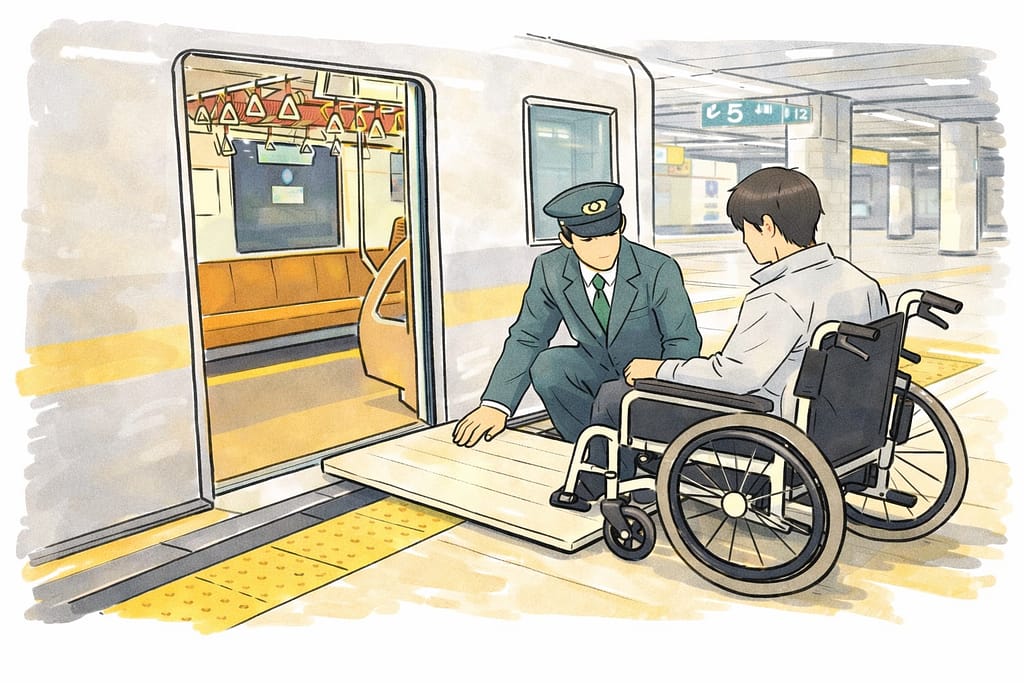 これまで、車いすを利用されている方は、駅の事務室で行き先を伝えることで、駅員がホームと車両の間に乗降用スロープ板を設置し、乗車の介助を行う仕組みが取られてきました。